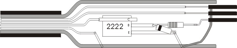 The resistor is 2.2K. The Transistor is a 2222. The Diode is a little glass thingy that had a band on it and was loose in the junk box. I'm sure it has a number, but I "don't ask, don't tell". The Coax is old RG-62. I don't know what other types might have enough give in the braid to allow you to assemble this "Fat Wire", but it sure is easy with the 62. I pulled the center conductor and insulator out using a vise, and pushed in two pair from some Cat 5 laying around. Cat 3 might be easier to push in (fewer twists per inch) but all my Cat 3 is in use on telephones!